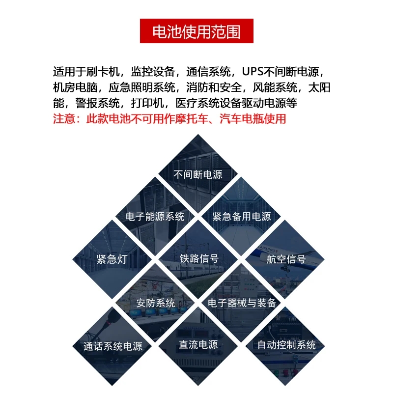 主要应用领域:通讯及电力设备; 紧急照明器材; 警示系统; 各种测距仪器; 办公室电脑、微电脑处理机及OA设备; UPS/EPS电源; 变、发电站紧急电源系统; 医疗器械; 便携式电源、录放机、收音机等; 电动玩具、割草机、吸尘器等各种电动工具; 摄像机; 手提式测量留言